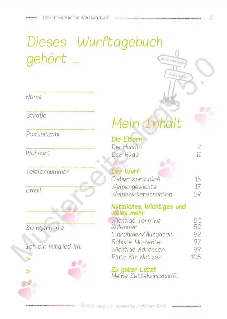 Das Wurftagebuch hat drei Kategorien: 1. Eltern – Hündin/Rüde, 2. Alles rund um den Wurf und 3. Organisatorisches, Nützliches und vieles mehr. Im ersten Teil kannst du wichtige Informationen zur Hündin und zum Deckrüden eintragen. Der zweite Teil enthält Geburtsprotokolle, Gewichtstabellen und Bögen zum Erfassen von deinen Welpeninteressenten. Abschließend ist im organisatorischen Teil ein 12-Wochenkalender, Listen für deine Ausgaben und Einnahmen, Platz für schöne Momente, Notizen und vieles mehr. Alles findest du in einem praktischen DinA4 Ordner, damit du das Wurftagebuch mit deinen Zetteln ergänzen kannst. Ganz hinten haben wir noch ein Fach für deine Zettelwirtschaft eingefügt, damit dir auch wirklich nichts verloren geht.